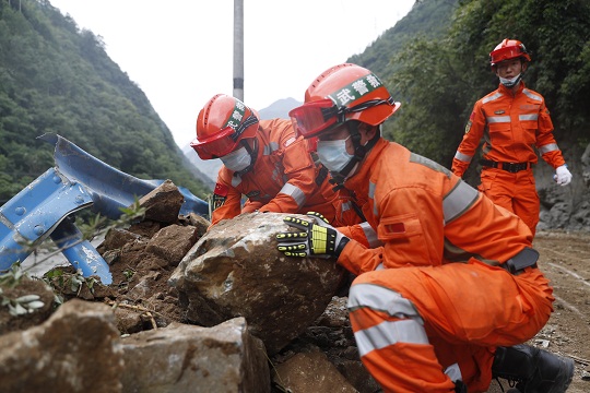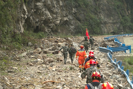 凌晨時分,李榮吉率領(lǐng)應(yīng)急救援隊伍,向距離駐點17公里外的大池溝村疏通道路,巨龍般的救援部隊沿315國道時而盤山而上,時而環(huán)山而下。由于不間斷的余震,不時有石頭和泥沙從頭頂飛下,一路上官兵們遇到多次塌方,公路全被亂石和爛泥淹沒,很多地方無路可走。