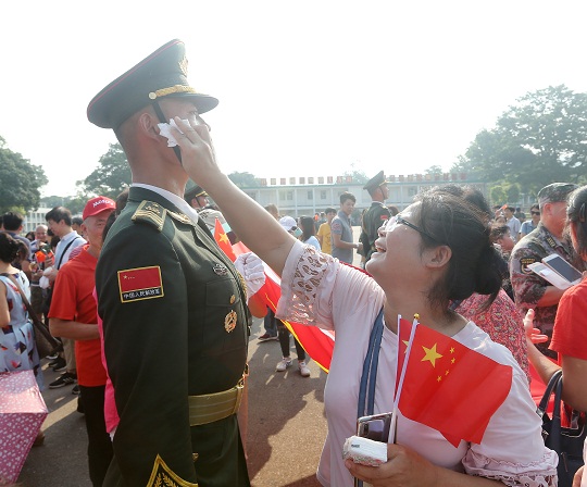 圖為香港市民為儀仗隊官兵擦汗。易定 攝