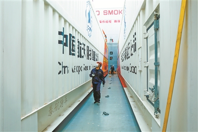 夜色漸濃,當(dāng)最后一個(gè)箱子對(duì)準(zhǔn)平臺(tái)底板,“咔……”16個(gè)卡扣嚴(yán)絲合縫,江成波結(jié)束了一天的工作。