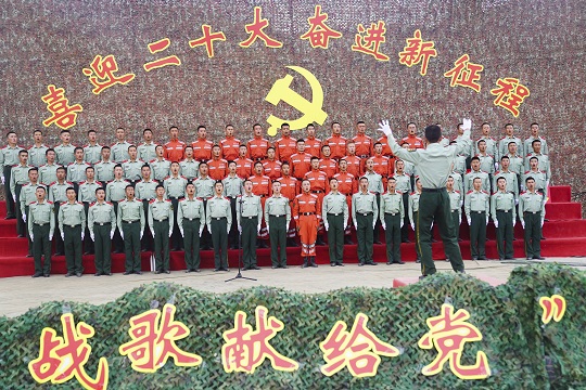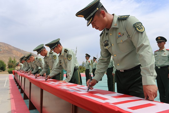 武警青??傟牂C動二支隊演訓場上,官兵們跨彈坑、攀云梯、翻高墻……突然一聲哨響:全體集合!大家集體重溫入黨誓詞。之后,官兵在寫有“永遠聽黨話,堅定跟黨走,喜迎二十大,奮進新征程”的橫幅上寫下自己的名字。