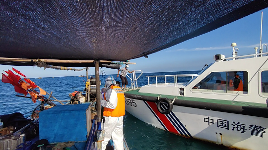 早上7時許,潮位基本達到脫淺條件,為盡快幫助遇險船主脫離危險,執(zhí)法員立即聯(lián)系當?shù)貪O民利用“小舢板”一同進行協(xié)助救援。經(jīng)過多次嘗試,早上8時許,執(zhí)法員成功將該漁民轉移至執(zhí)法艇,執(zhí)法員一邊安撫該漁民情緒,一邊對其進行防疫和安全檢查,迅速返航后移交給至當?shù)貪O政部門進行后續(xù)工作。