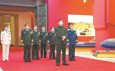 圖為在慶祝中國人民解放軍建軍95周年之際,中共中央總書記、國家主席、中央軍委主席習(xí)近平7月27日前往中國人民革命軍事博物館,參觀“領(lǐng)航強(qiáng)軍向復(fù)興——新時(shí)代國防和軍隊(duì)建設(shè)成就展”。本報(bào)記者范顯海 攝