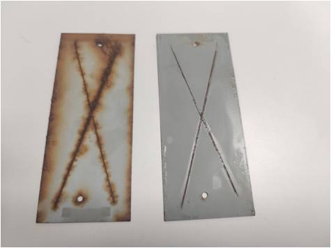 圖為高溫高濕自然環(huán)境下放置12個月的金屬表面,右為刷涂YJ-13金屬防銹液的金屬表面。