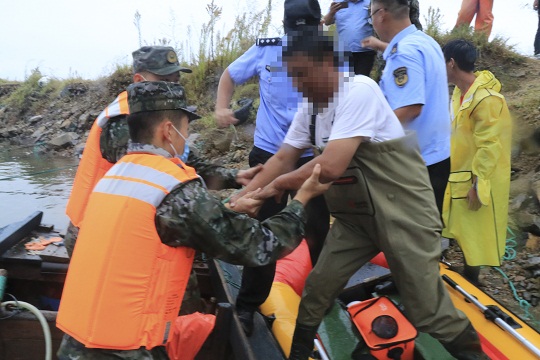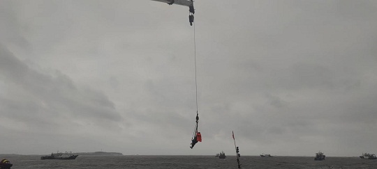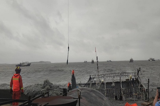 9月16日,山東威海海警局接到報警稱,一艘漁船在榮成市神飛造船廠附近海域發(fā)生船舶傾覆,兩名群眾被困,受臺風“梅花”影響,事發(fā)海域風力達7級以上,浪高3-5米,情況十分危急。海警執(zhí)法員第一時間趕赴現(xiàn)場,并對接相關部門聯(lián)合行動。海警執(zhí)法員不斷向被困群眾喊話安撫情緒,并采取吊車起吊的方式實施救援。經(jīng)過近一個小時的努力,兩名群眾安全脫困,目前身體狀況良好。