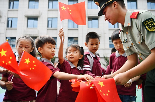 圖為武警戰(zhàn)士在向小學(xué)生發(fā)送手持國旗。