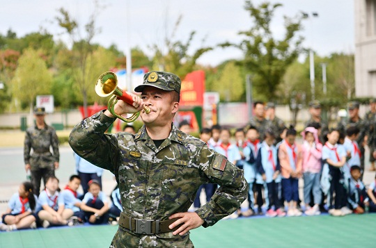 圖為武警戰(zhàn)士在向小學(xué)生演示吹奏軍號。
