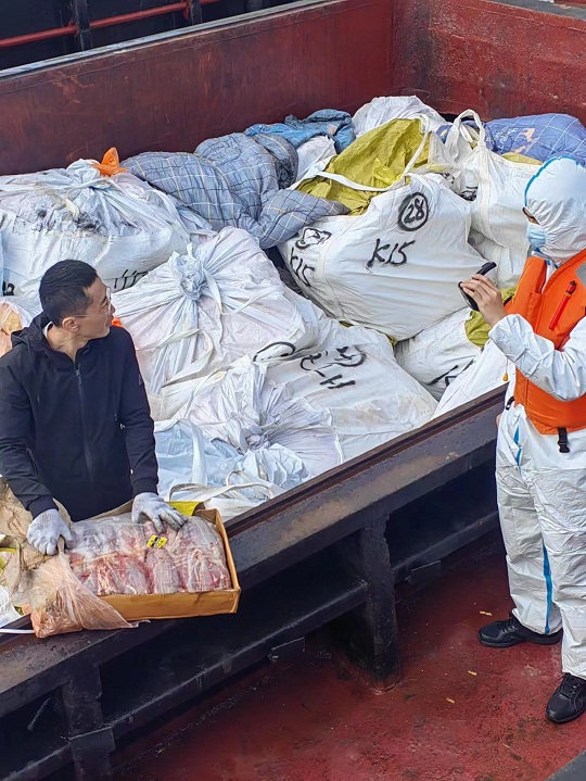 執(zhí)法人員登臨檢查發(fā)現(xiàn),該嫌疑船舶載有無合法來源證明的牛肉、牛肚等凍品共計約200余噸,涉嫌走私,海警執(zhí)法員當場對涉案船舶及所載凍品進行扣押。目前,該局已協(xié)調(diào)防疫部門對涉案凍品進行取樣和消殺,對涉案人員進行核酸檢測及隔離,案件正在進一步偵辦中。