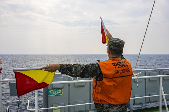 圖為中國海警4304艦執(zhí)法員在中越聯(lián)合巡航期間使用信號(hào)旗對船只進(jìn)行引導(dǎo)。