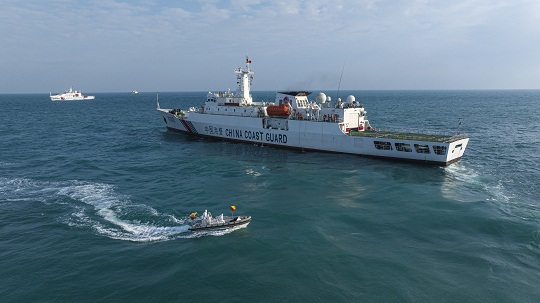 圖為中國海警4304艦艇編隊(duì)與越南海警8004艦艇編隊(duì)協(xié)同開展海上搜救演練。