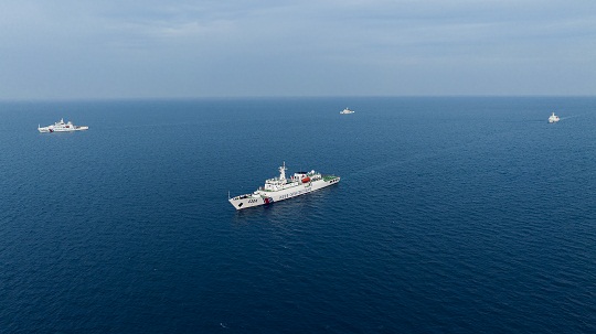 圖為中國海警4304艦艇編隊(duì)與越南海警8004艦艇編隊(duì)沿中越北部灣分界線進(jìn)行巡航。