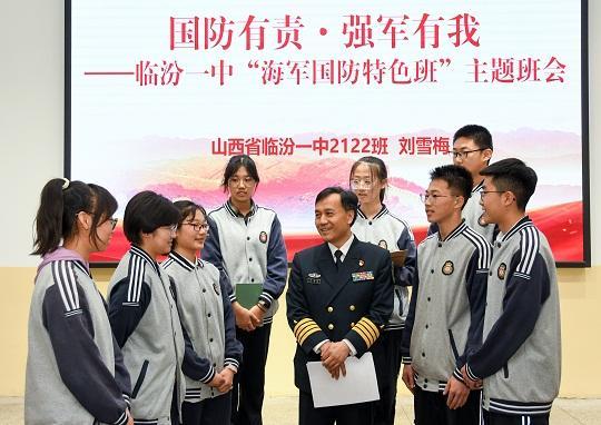 圖為臨汾軍分區(qū)大校政治委員劉海洋(右三)為臨汾第一中學(xué)“海軍國防特色班”學(xué)生講述經(jīng)典戰(zhàn)例。李旭峰 攝