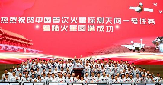 圖為北京航天飛行控制中心青年科技人才群體慶祝我國首次火星探測天問一號任務(wù)著陸火星成功。