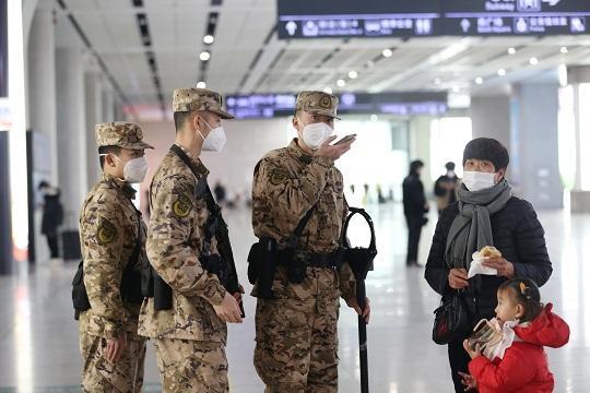 圖為武警安徽總隊(duì)合肥支隊(duì)官兵為旅客提供幫助。本報(bào)通訊員 董浩朋 攝