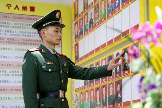 圖為清明節(jié)前夕,武警浙江總隊(duì)金華支隊(duì)執(zhí)勤二中隊(duì)二級(jí)上士何浩在中隊(duì)榮譽(yù)室緬懷父親何章法。慕仲驊 攝