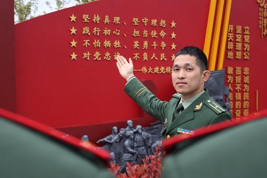 圖為武警工程大學(xué)學(xué)員萬鴻玥在武警安徽總隊(duì)合肥支隊(duì)史館父親萬四海的雕像旁緬懷追思。徐偉 攝