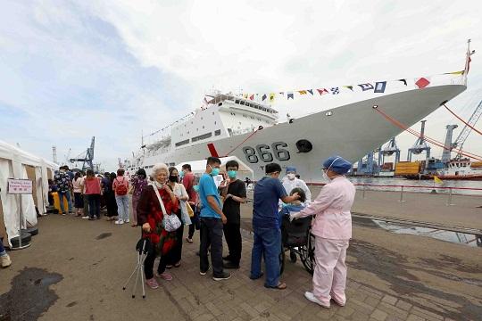 圖為2022年11月11日,“和諧使命—2022”任務(wù)醫(yī)療服務(wù)在印尼雅加達(dá)丹戎不碌港碼頭和“和平方舟”號醫(yī)院船上同時(shí)如期展開。蒲海洋 攝