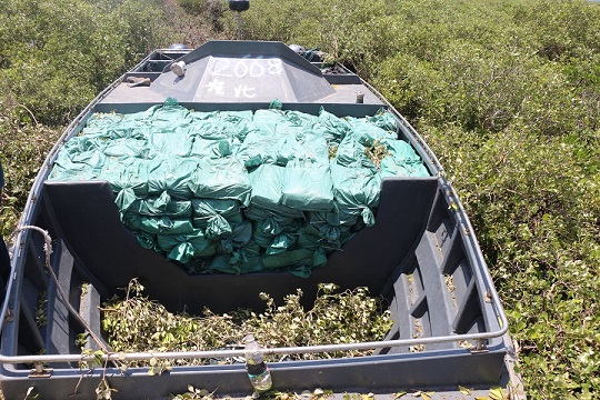 無人機(jī)始終鎖定目標(biāo)、執(zhí)法艇在后窮追不舍,歷時(shí)2個(gè)小時(shí)將走私摩托艇逼進(jìn)紅樹林?jǐn)R淺。經(jīng)檢查,該摩托艇載有凍雞爪一批,現(xiàn)場(chǎng)未發(fā)現(xiàn)該批凍雞爪合法手續(xù)及相關(guān)證明,涉嫌走私。經(jīng)清點(diǎn),該批凍雞爪5.3噸,案值約20萬元。