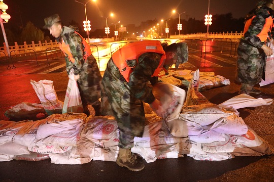 7月31日上午,北京市昌平區(qū)北沙河水位暴漲,南側(cè)大堤出現(xiàn)決口,上千名群眾被困。中部戰(zhàn)區(qū)空軍某部啟動應(yīng)急預(yù)案,組織出動10余臺車輛,攜帶救援物資奔赴受災(zāi)地區(qū)。到達(dá)現(xiàn)場后,官兵裝填沙袋、在水中搭人墻減緩水流,同時迅速開展排查搜救,轉(zhuǎn)移受災(zāi)群眾。通過與地方政府密切配合,排查受災(zāi)居民數(shù)百戶,轉(zhuǎn)運群眾近400人。