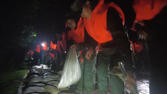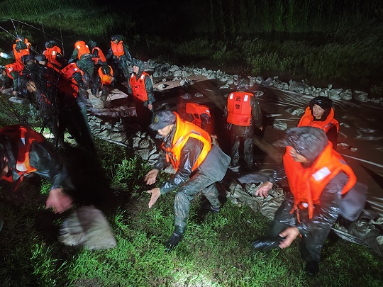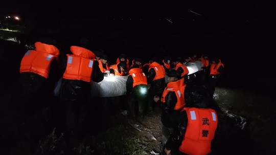 8月4日19時25分,武警黑龍江總隊齊齊哈爾支隊出動200余名官兵,動用車輛10余臺,第一時間到達現(xiàn)場。連夜奮戰(zhàn)5小時,雅魯河河道兩側(cè)壘筑沙袋4700余個,筑起長280米,高0.5米的阻隔沙墻,處置管涌2處,完成13米道路阻堤任務(wù),利用無紡布封補滲點110米,筑起守護人民群眾的安全堤壩。截至目前,搶險救援工作仍在緊張進行中。
