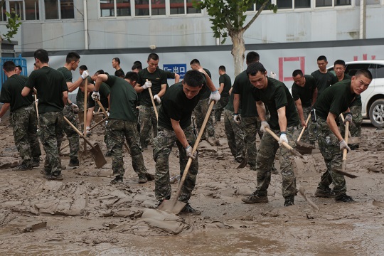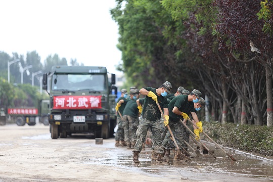 圖為武警河北總隊石家莊支隊官兵在河北涿州市陽光大街清理淤泥。楊劉 攝
