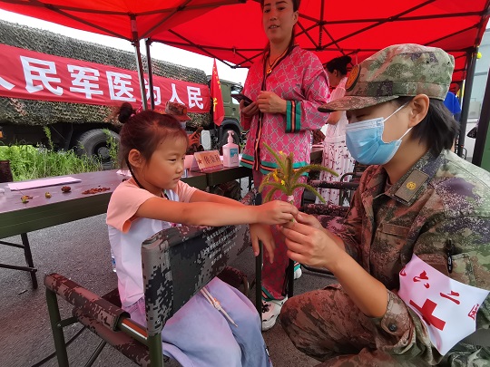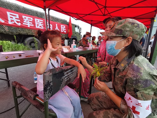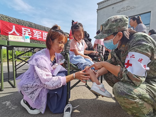 “寶貝兒放心,阿姨一定仔細(xì)給你瞧瞧,對癥用藥之后,就不會(huì)又癢又疼了?!贬t(yī)療隊(duì)員孟博從診斷席上走出來,將小女孩兒抱上軍用折疊椅,輕輕地?cái)]起小女孩兒的褲腿,發(fā)現(xiàn)小腿局部皮膚會(huì)出現(xiàn)紅腫、水皰,且有明顯瘙癢等癥狀,初步診斷為被毒蚊叮咬浸水感染。隨即對其創(chuàng)面清潔、消毒、涂藥,之后又給她贈(zèng)送了止癢、消腫、消炎等藥品,并向她媽媽交代了注意事項(xiàng)。