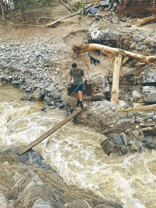 圖為某旅官兵攜帶裝備通過(guò)臨時(shí)搭建的簡(jiǎn)易木板橋。唐琦智 攝