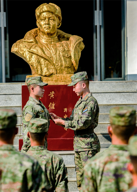 圖為“模范空降兵連”官兵在黃繼光銅像前組織授予榮譽(yù)編號(hào)儀式。王寶強(qiáng) 攝