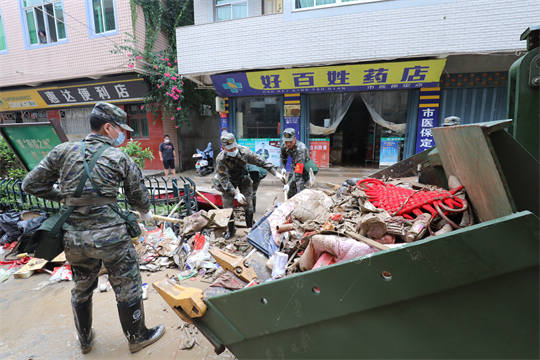 圖為武警第二機(jī)動總隊某支隊救援官兵在一線清運(yùn)垃圾。薛東東 攝