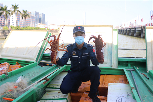 經(jīng)查,船上共有船員2名,該涉案船舶無(wú)船名船號(hào),貨艙暗格里發(fā)現(xiàn)載有龍蝦、巨骨舌魚(yú)苗等。經(jīng)清點(diǎn),活體龍蝦共95箱約1500公斤,巨骨舌魚(yú)苗約1000條,現(xiàn)場(chǎng)人員均無(wú)法提供貨物合法來(lái)源證明,海警執(zhí)法員依法將涉案船只及貨物帶回作進(jìn)一步調(diào)查處理。