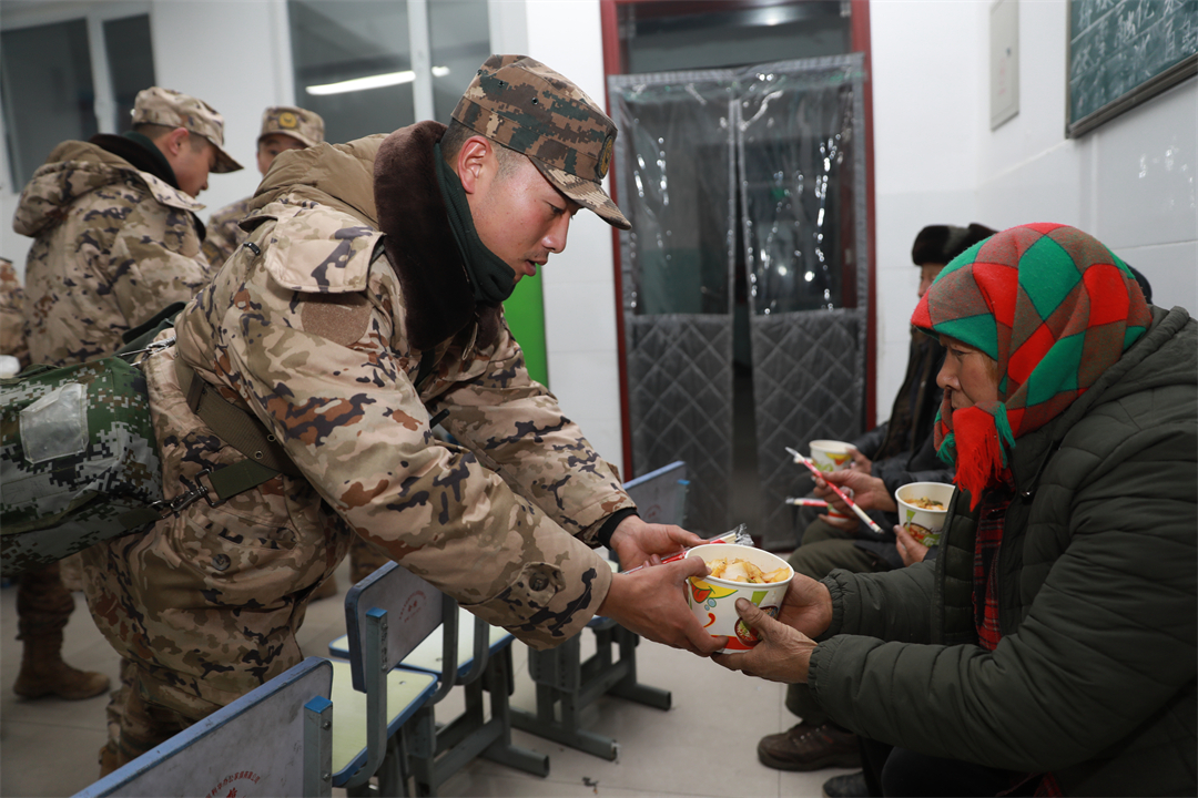 圖為武警青??傟?duì)任務(wù)官兵為受災(zāi)群眾提供熱食。張先云 攝