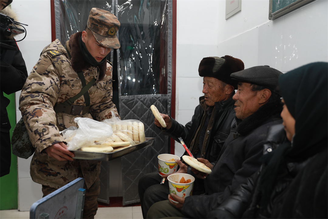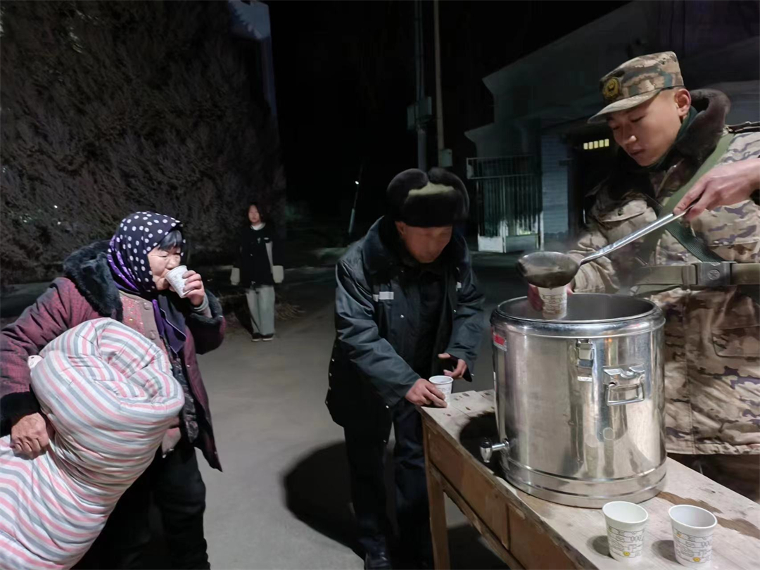 20余名炊事員搭鍋支灶,制作熱食。同時(shí),他們還第一時(shí)間為群眾熬制熱姜湯,驅(qū)寒保暖。經(jīng)過(guò)兩個(gè)多小時(shí)忙碌,熱氣騰騰的羊肉粉湯做熟了,配上熱乎乎的餅子,200余名群眾吃上災(zāi)后第一頓熱乎飯。