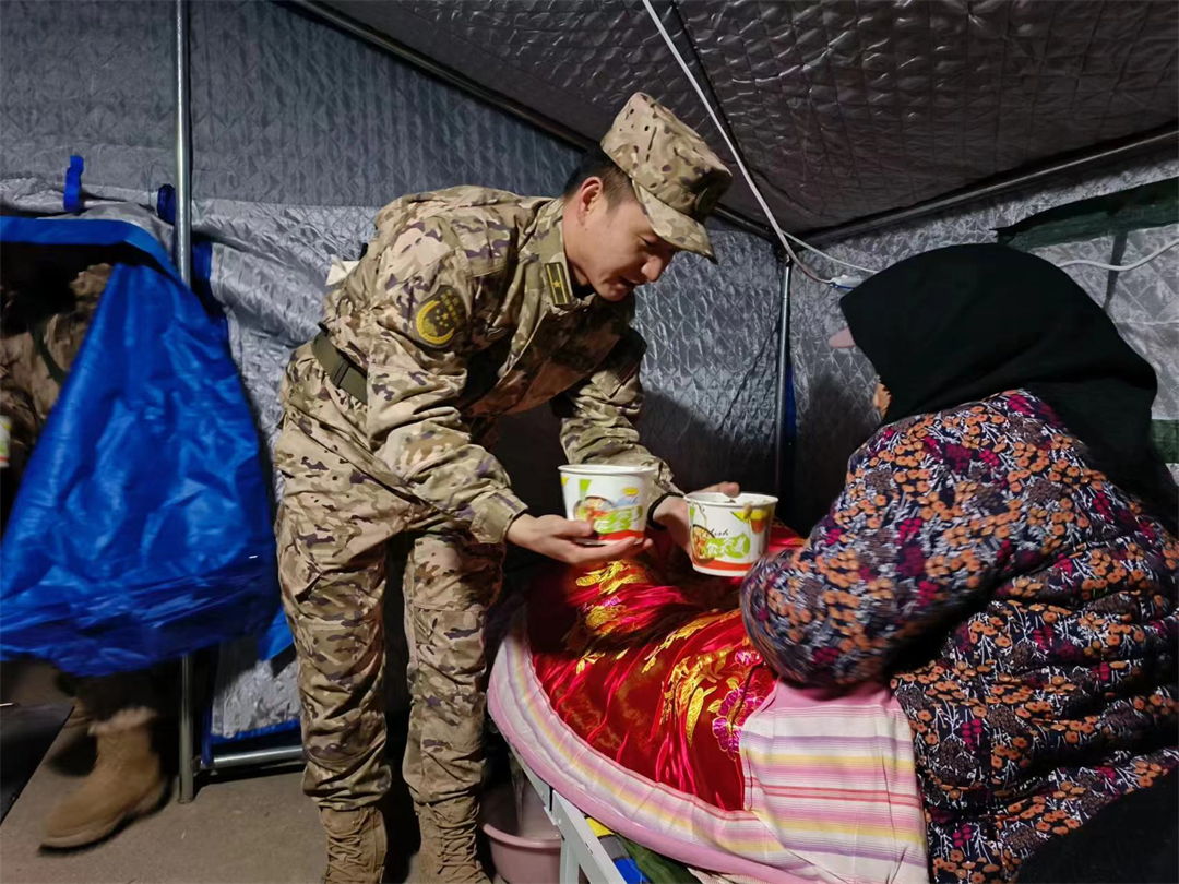 飯后已近晚上9點(diǎn),群眾陸續(xù)回到自己的帳篷,室外氣溫降至零下七八攝氏度。官兵們不言苦、不怕累,收拾妥當(dāng)后,又分組對(duì)安置點(diǎn)進(jìn)行安全檢查、為有需要的群眾送去毛毯、統(tǒng)計(jì)物資藥品、準(zhǔn)備第二天早飯……