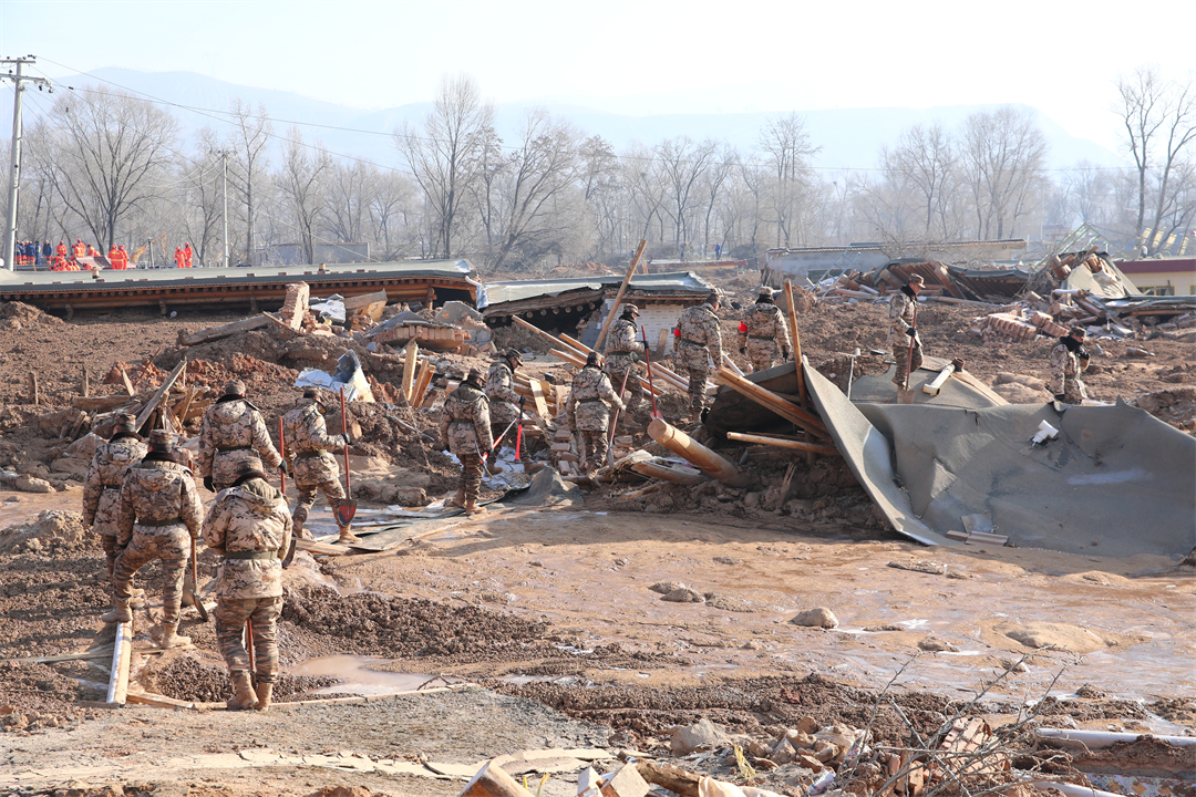 圖為12月20日,武警青??傟牂C動一支隊官兵在青海省海東市民和縣中川鄉(xiāng)草灘村泥石流現(xiàn)場進(jìn)行搜救。羅元凱 攝