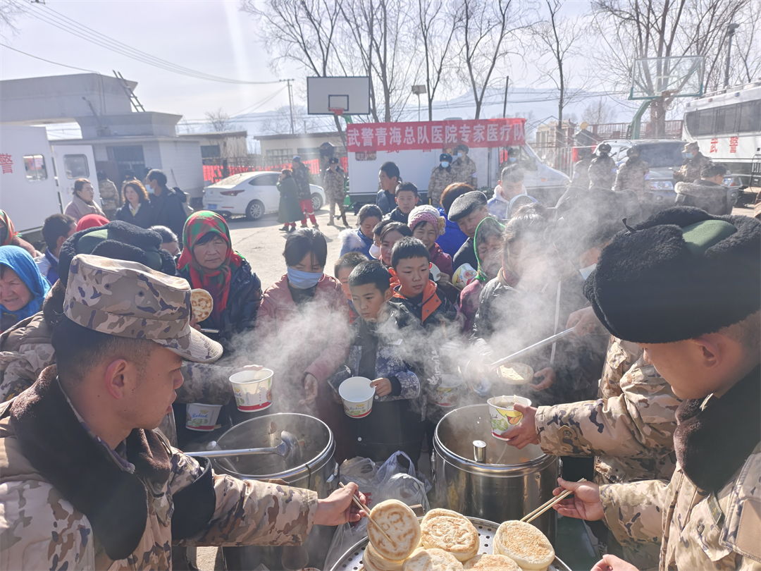 圖為12月20日,武警青??傟牴俦谇嗪J『|市民和縣中川鄉(xiāng)草灘村安置點為群眾分發(fā)熱食。李少平 攝