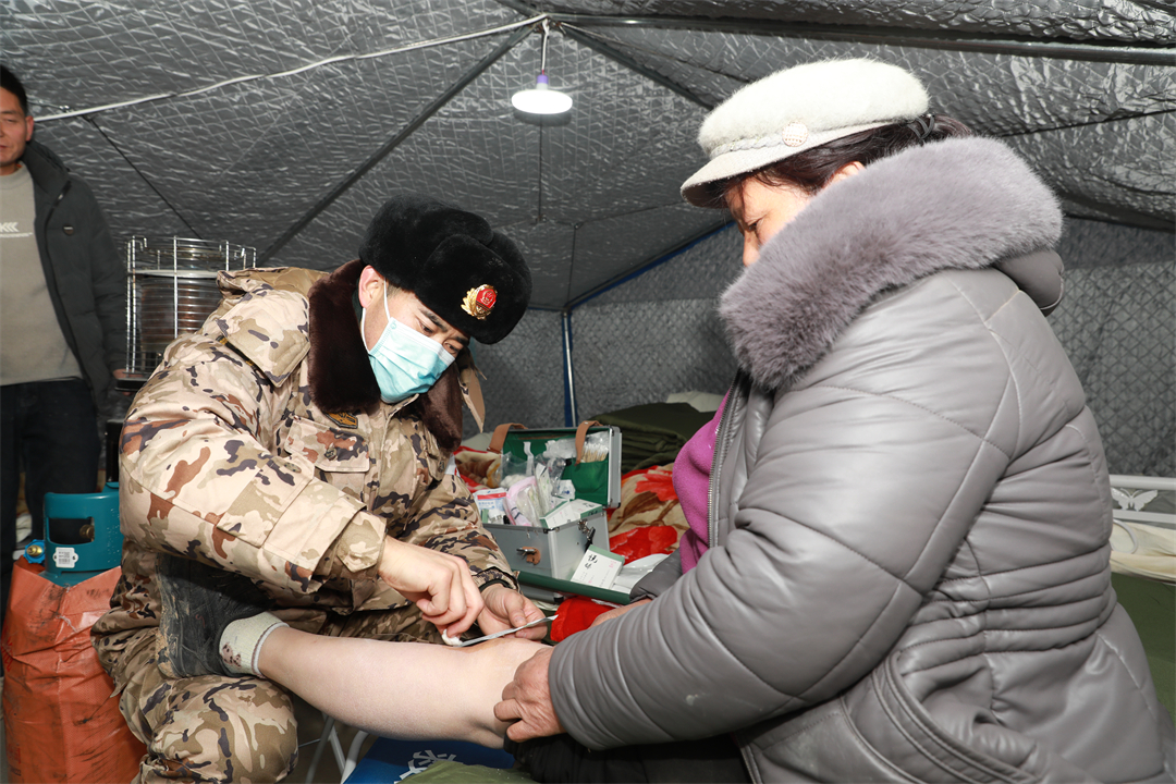 圖為12月19日,武警青??傟犪t(yī)院軍醫(yī)在青海省海東市民和縣中川鄉(xiāng)草灘村安置點為群眾診療。曹展 攝