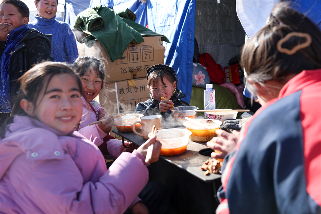 圖為12月21日,在甘肅省臨夏州積石山縣劉集鄉(xiāng)陽(yáng)屲村安置點(diǎn),小朋友們吃著武警甘肅總隊(duì)臨夏支隊(duì)官兵制作的熱食,臉上露出了幸福的笑容。