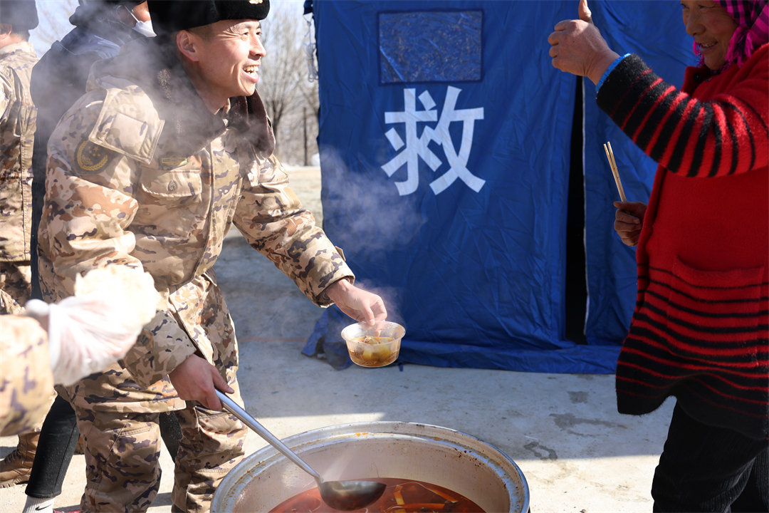 12月21日中午,武警甘肅總隊(duì)臨夏支隊(duì)官兵在積石山縣劉集鄉(xiāng)陽(yáng)屲村受災(zāi)群眾安置點(diǎn)搭帳篷、送物資,利用野戰(zhàn)給養(yǎng)單元為群眾制作熱食。群眾說(shuō):“人民軍隊(duì)愛(ài)人民,謝謝你們的關(guān)心!”