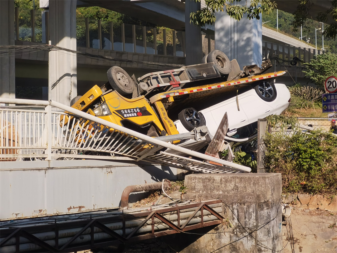 12月24日15時許,在廣東海警局駐深圳某部大門前,一輛裝載私家車的東風(fēng)道路救援車在河邊發(fā)生側(cè)翻,車內(nèi)3名人員被困車中,車體壓在橋旁護(hù)欄上,隨時有掉落河中的危險,情況十分危險。