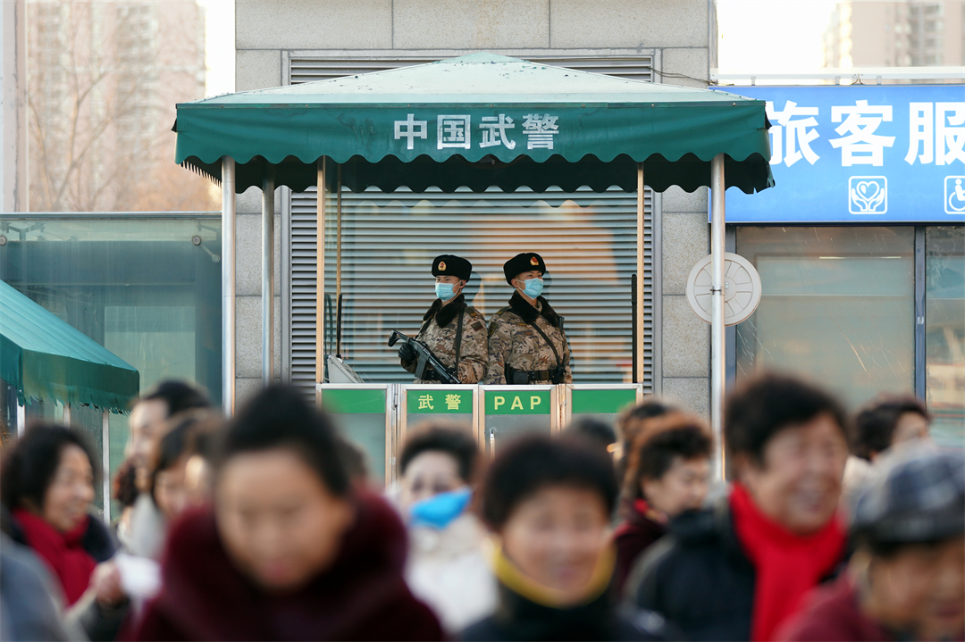 圖為北京西站南廣場(chǎng)旅客人頭攢動(dòng),武警官兵警惕執(zhí)勤。