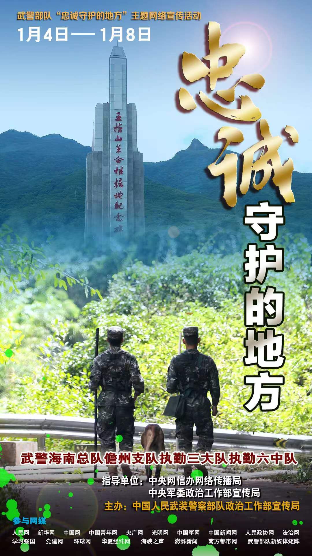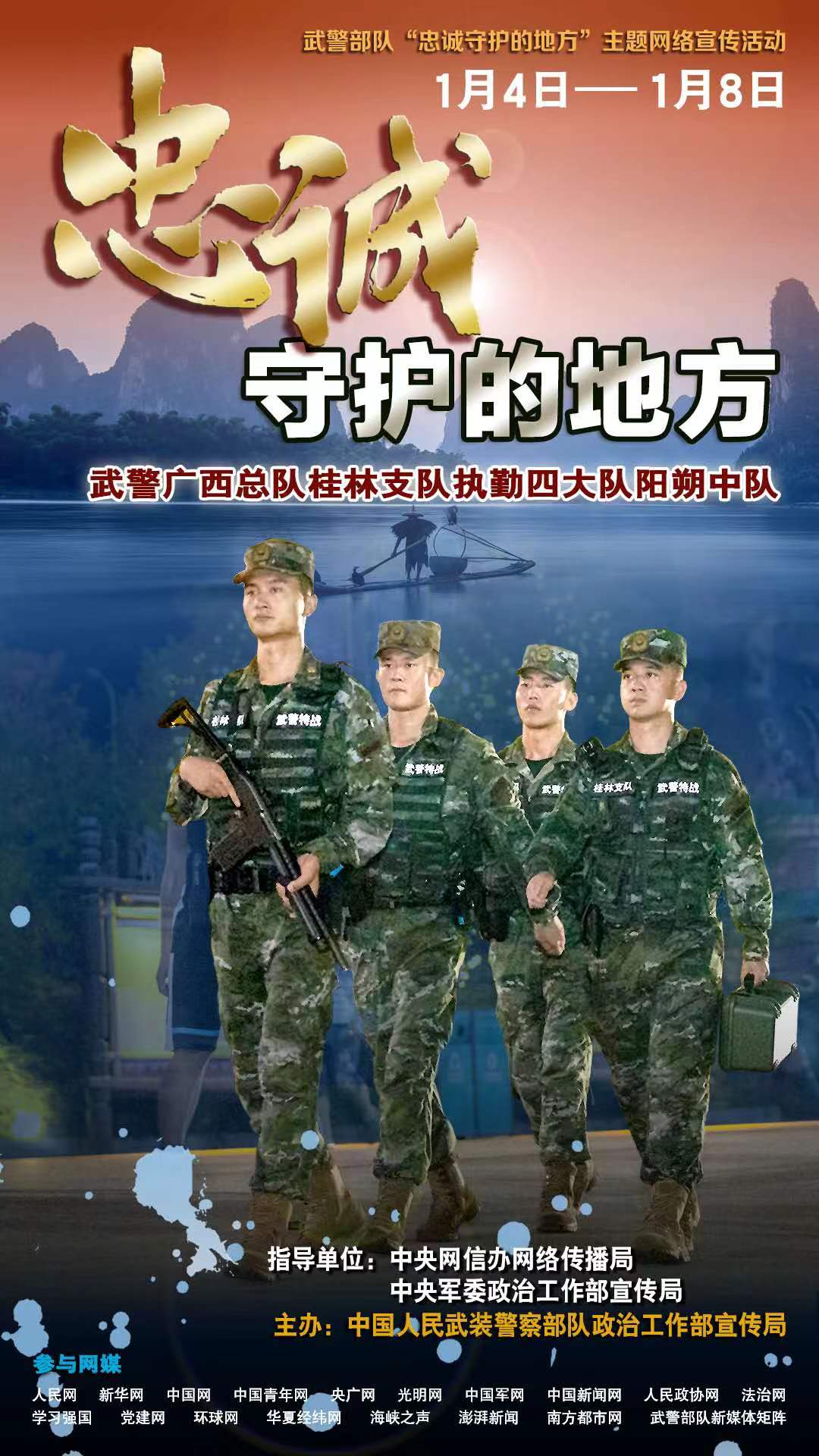 萬家燈火有我守護(hù),平凡哨位書寫忠誠。無論北疆雪原還是南域海島,無論繁華都市還是大漠荒灘,祖國各地到處都有武警官兵站哨執(zhí)勤的身影、到處都是他們忠誠守護(hù)的地方。為真實(shí)反映新時(shí)代武警部隊(duì)忠誠擔(dān)當(dāng)使命、守衛(wèi)社會安寧的堅(jiān)強(qiáng)決心和堅(jiān)定行動,立體展現(xiàn)“人民武警愛人民、人民武警為人民”的宗旨情懷,近期,在中央網(wǎng)信辦網(wǎng)絡(luò)傳播局和中央軍委政治工作部宣傳局指導(dǎo)下,武警部隊(duì)政治工作部宣傳局策劃組織了“忠誠守護(hù)的地方”主題網(wǎng)絡(luò)宣傳活動,集中對武警遼寧總隊(duì)錦州支隊(duì)執(zhí)勤四大隊(duì)凌海中隊(duì)、廣西總隊(duì)桂林支隊(duì)執(zhí)勤四大隊(duì)陽朔中隊(duì)、海南總隊(duì)儋州支隊(duì)執(zhí)勤三大隊(duì)執(zhí)勤六中隊(duì)、陜西總隊(duì)銅川支隊(duì)執(zhí)勤一大隊(duì)等4個(gè)先進(jìn)基層單位,進(jìn)行面對面采訪和網(wǎng)絡(luò)化報(bào)道。