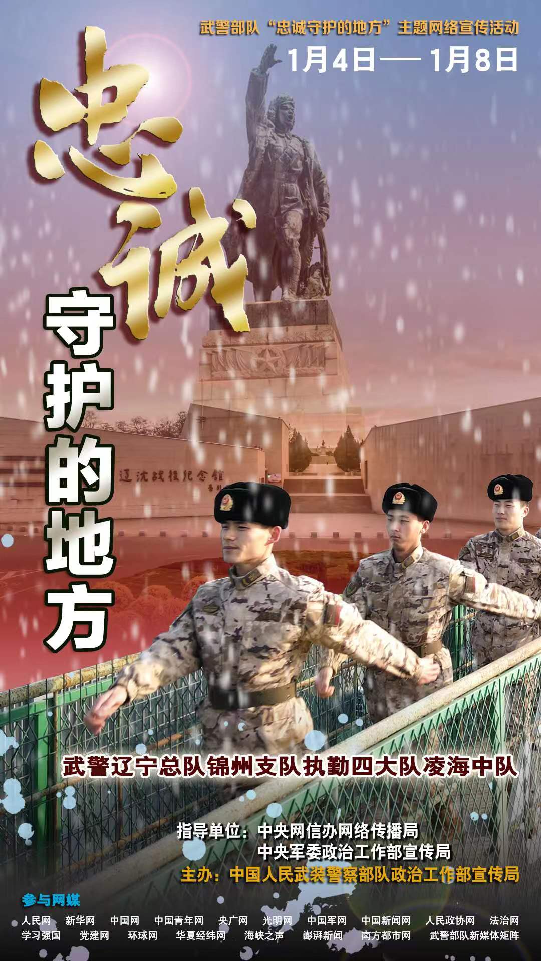 據(jù)悉,此次活動已完成前期采訪,網(wǎng)上宣傳于1月4日啟動,將持續(xù)至1月8日,屆時(shí)人民網(wǎng)、新華網(wǎng)、中國軍網(wǎng)等多家主流網(wǎng)媒,每日以圖文、視頻等形式依次對受訪單位展開報(bào)道,武警部隊(duì)新媒體矩陣同步跟進(jìn)推送。
