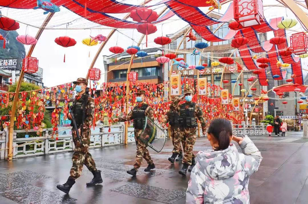 圖為春節(jié)期間,武警陽(yáng)朔中隊(duì)官兵在陽(yáng)朔西街開展巡邏勤務(wù)。