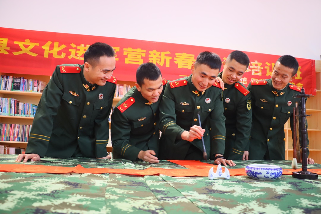 圖為春節(jié)期間,武警陽(yáng)朔中隊(duì)官兵組織寫春聯(lián)。