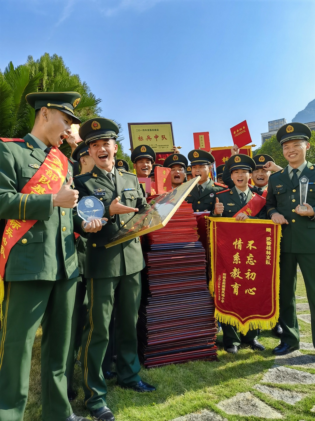 圖為武警陽(yáng)朔中隊(duì)官兵與歷年獲得的榮譽(yù)獎(jiǎng)牌合影。