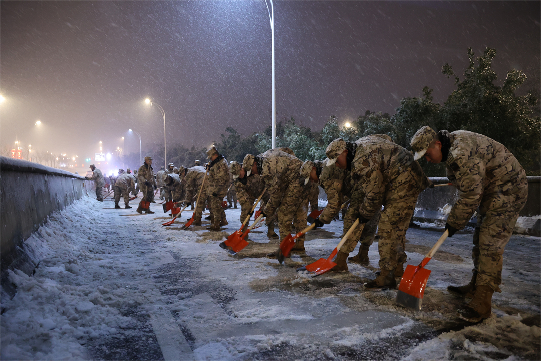 4日凌晨,武警湖北總隊(duì)訓(xùn)練基地接到駐地政府救援請(qǐng)求,駐地金山大道、臨空港大道等周邊多條高架和快速路匝道結(jié)冰,進(jìn)出車輛通行受到嚴(yán)重影響,已發(fā)生多起車禍。2時(shí)30分許,他們緊急出動(dòng)投入到破冰搶險(xiǎn)工作中,至4日8時(shí),累計(jì)清理結(jié)冰道路2公里,清掃積雪15000多平方米,得到地方政府和人民群眾的高度贊譽(yù)。