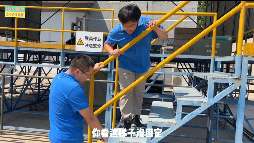 “這個(gè)梯子沒固定,上下平臺(tái)很容易摔倒?!币曨l中,小翟叫住正準(zhǔn)備登上平臺(tái)的小劉,并帶著他一起將四個(gè)輪子鎖緊。這是在調(diào)試平臺(tái)測試時(shí)容易被忽略的一處隱患,視頻通過糾錯(cuò)的方式,講解登高作業(yè)的操作規(guī)范,讓大家更容易入腦入心。