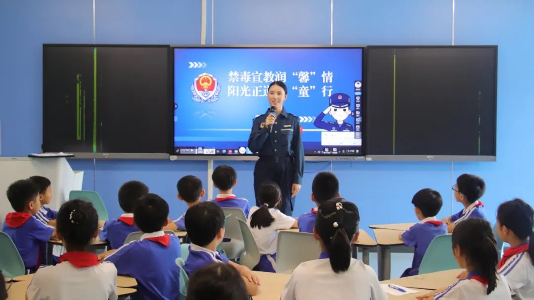 圖為6月17日,深圳海警局在深圳蓮南小學舉行禁毒宣講進校園活動,執(zhí)法員正在給同學們講解禁毒知識。