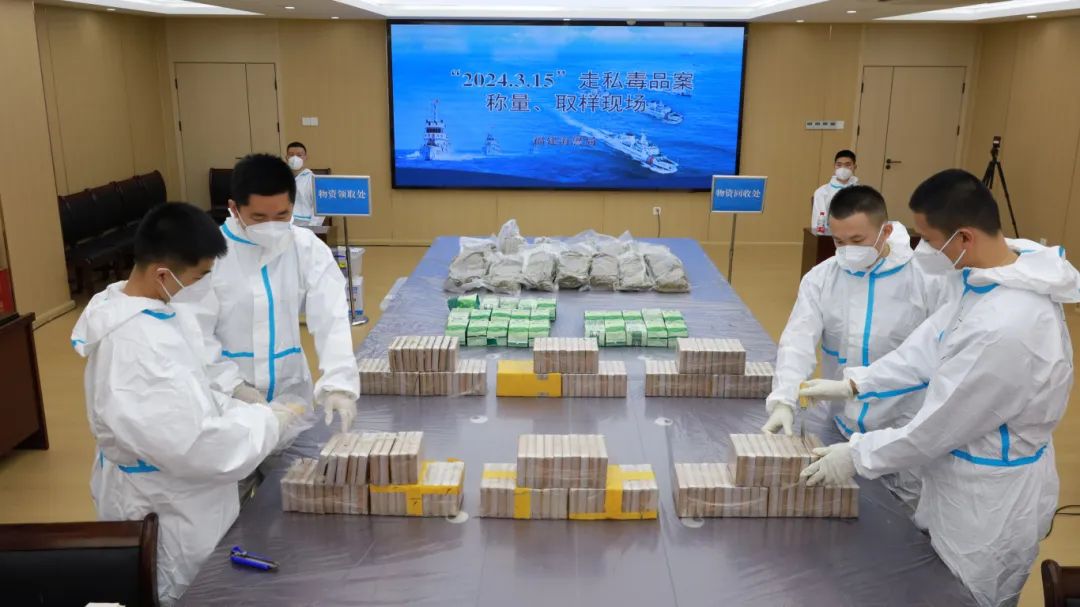 圖為今年3月,福建海警局破獲“2024.3.15”特大走私毒品案,海警執(zhí)法員對涉案毒品稱量、取樣。
