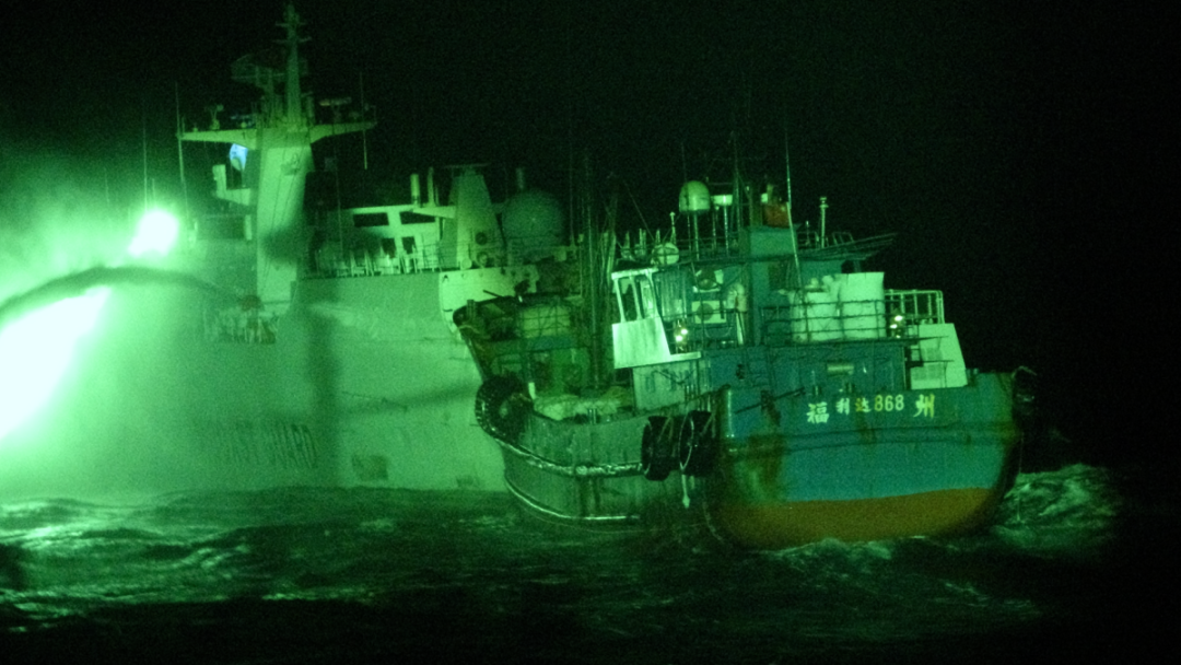 圖為2023年2月2日,中國海警局直屬第三局四方艦正在對“2022-363”海上特大毒品案的涉案船只進行水炮噴射,強行逼停目標船只。