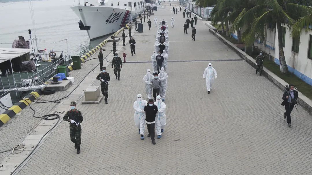 圖為2023年2月4日,中國海警局直屬第三局執(zhí)法員押解“2022-363”海上特大毒品案涉案人員。